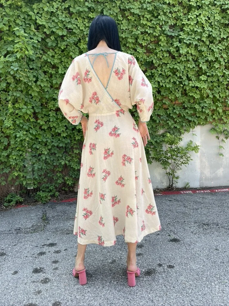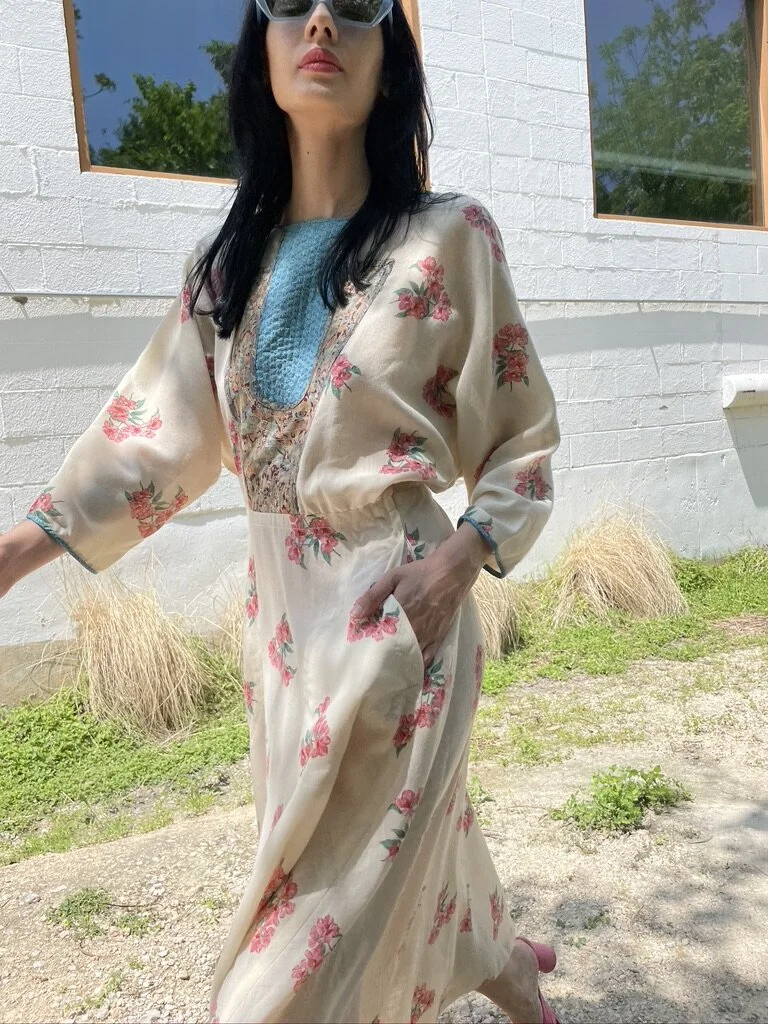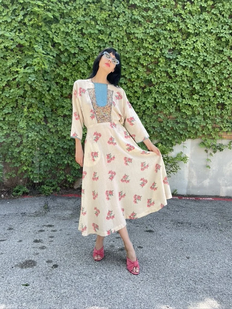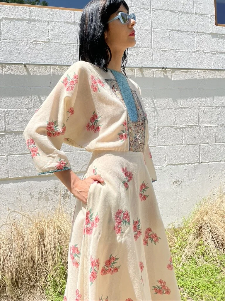 We love Koos Van Den Akker so much. This 70s summer dress is so easy breezy. Full floral skirt with batwing sleeve. Classic Koos quilted silk bib in alternating fabrics. The open V back ties at the neck. Zips up the side and has pockets!