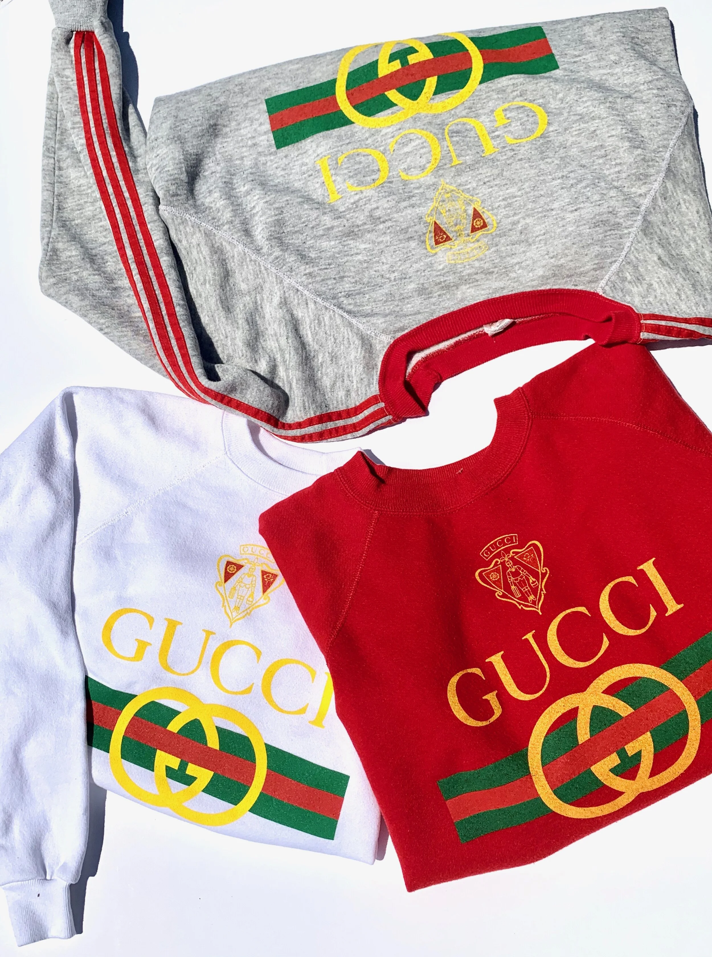 Vintage sweatshirts with contemporary bootleg Gucci screenprints. Various sizes and colors. Grab your Gucci and GO!