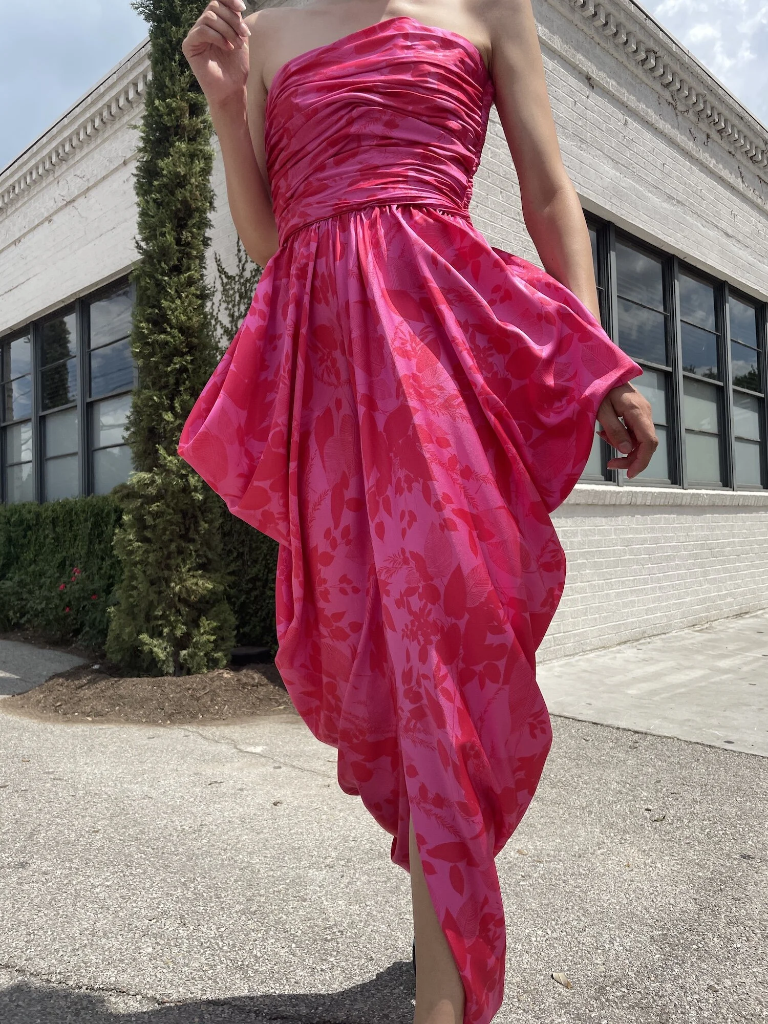 Talk about FUN! This 80s party dress by Victor Costa is to die for. Ruched bodice with insane draped skirt. Stunning hot pink and magenta floral printed silk. You’re sure to be the life of the party in this one!