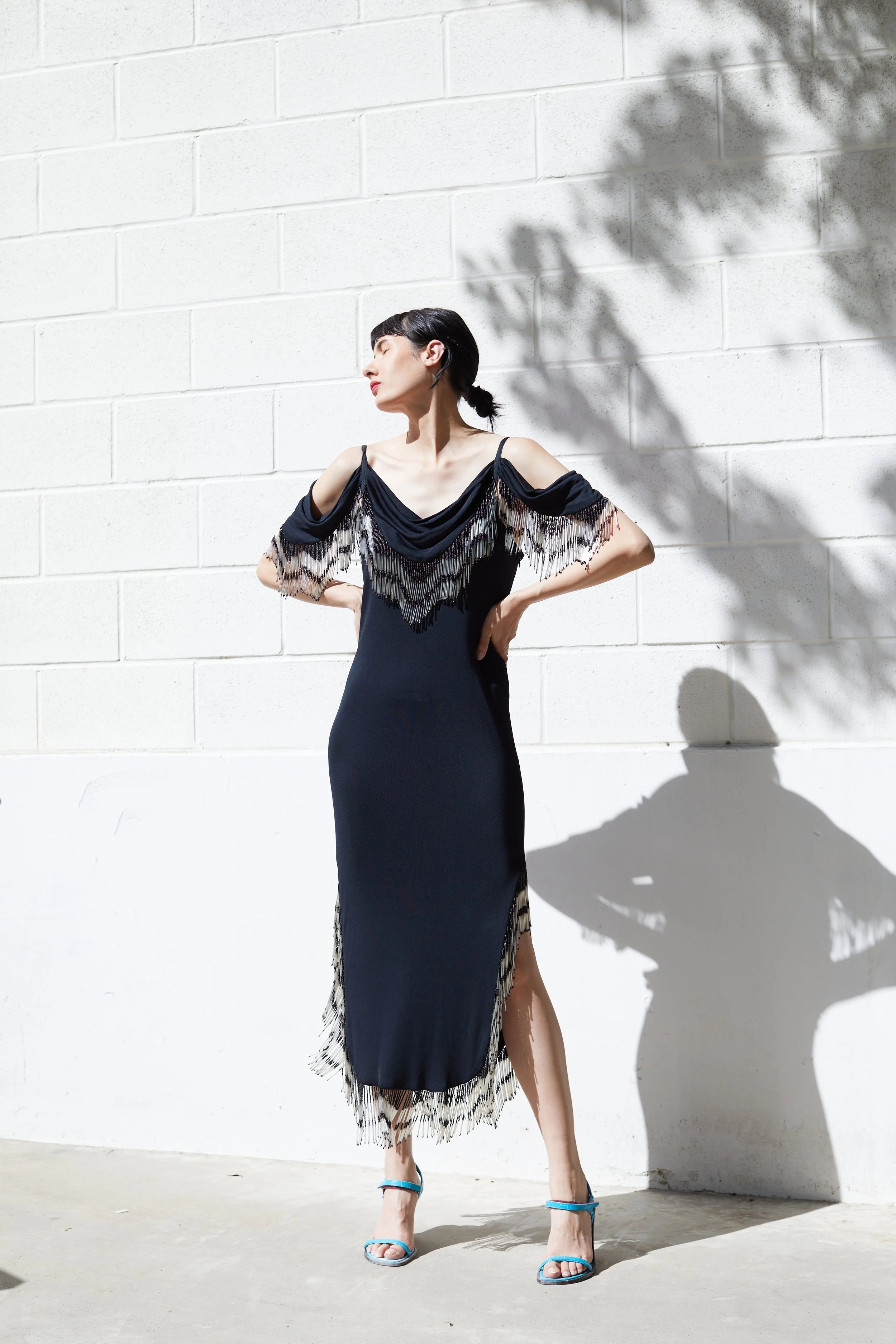 TONY CHASE 80s Beaded Fringe Off The Shoulder Dress