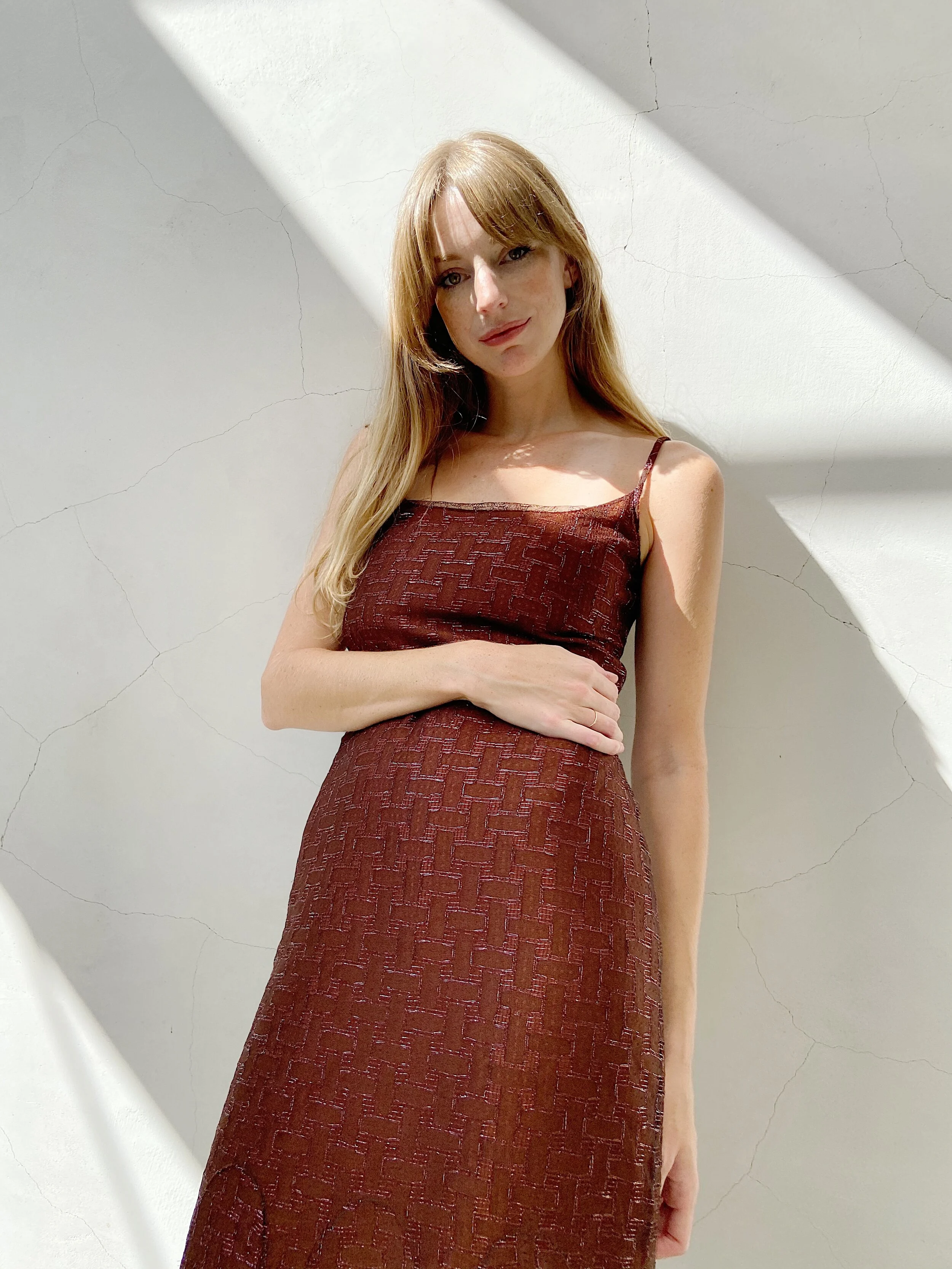 True Chanel elegance can be appreciated on this Fall 1999 Chanel trumpet gown. The details on this dress make it truly special. Dress is lined in a bronze iridescent thicker fabric with a beautiful sheer brown lurex overlay. Overlay has a perforated rectangle pattern and all the sewn in lurex is the perfect pop. Spaghetti strap trumpet style dress with bias cut panels at the hem for added movement. This dress zips up the back and is finished with signature CC copper buttons.