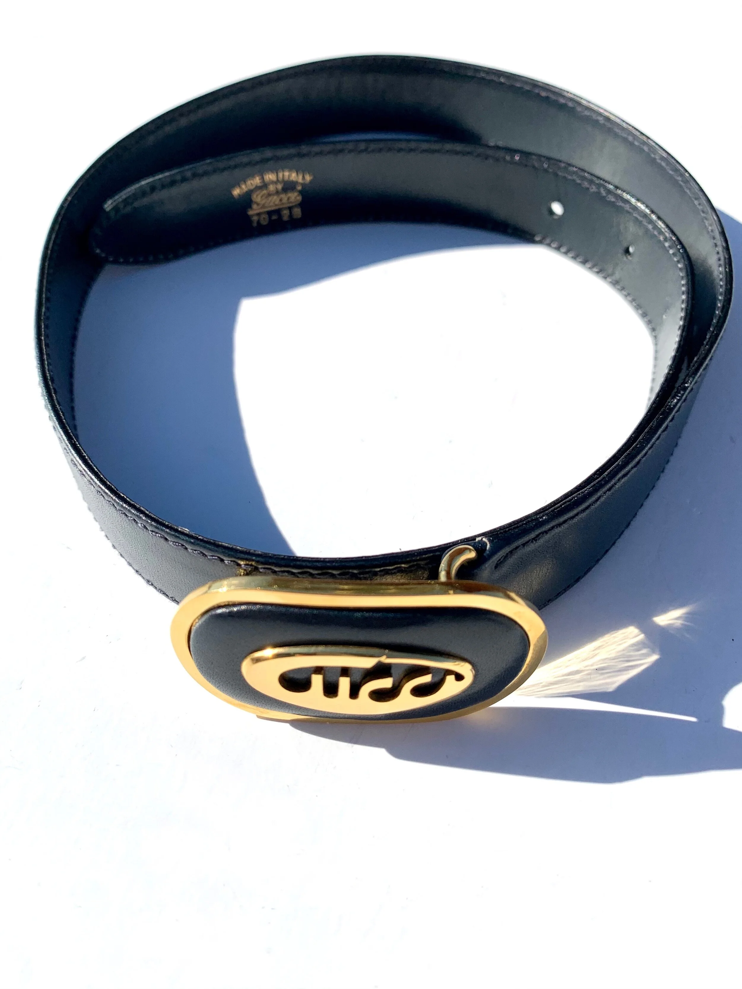 Super fun 80s Gucci signature belt in a rich navy leather. This particular Gucci belt is so unique and perfect for styling. Oval shaped buckle with cursive Gucci script in gold-tone metal. So fab!