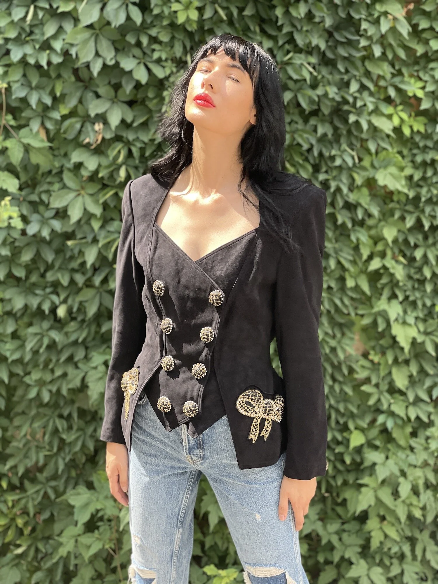 Jitrois makes the most fabulous leather pieces we’ve ever seen, and this jacket is no exception. Stunning three dimentional gold bows and buttons embellish the front. Who says you have to wait until winter to start planning your holiday outfits? Comes with original tags attached for $2900!