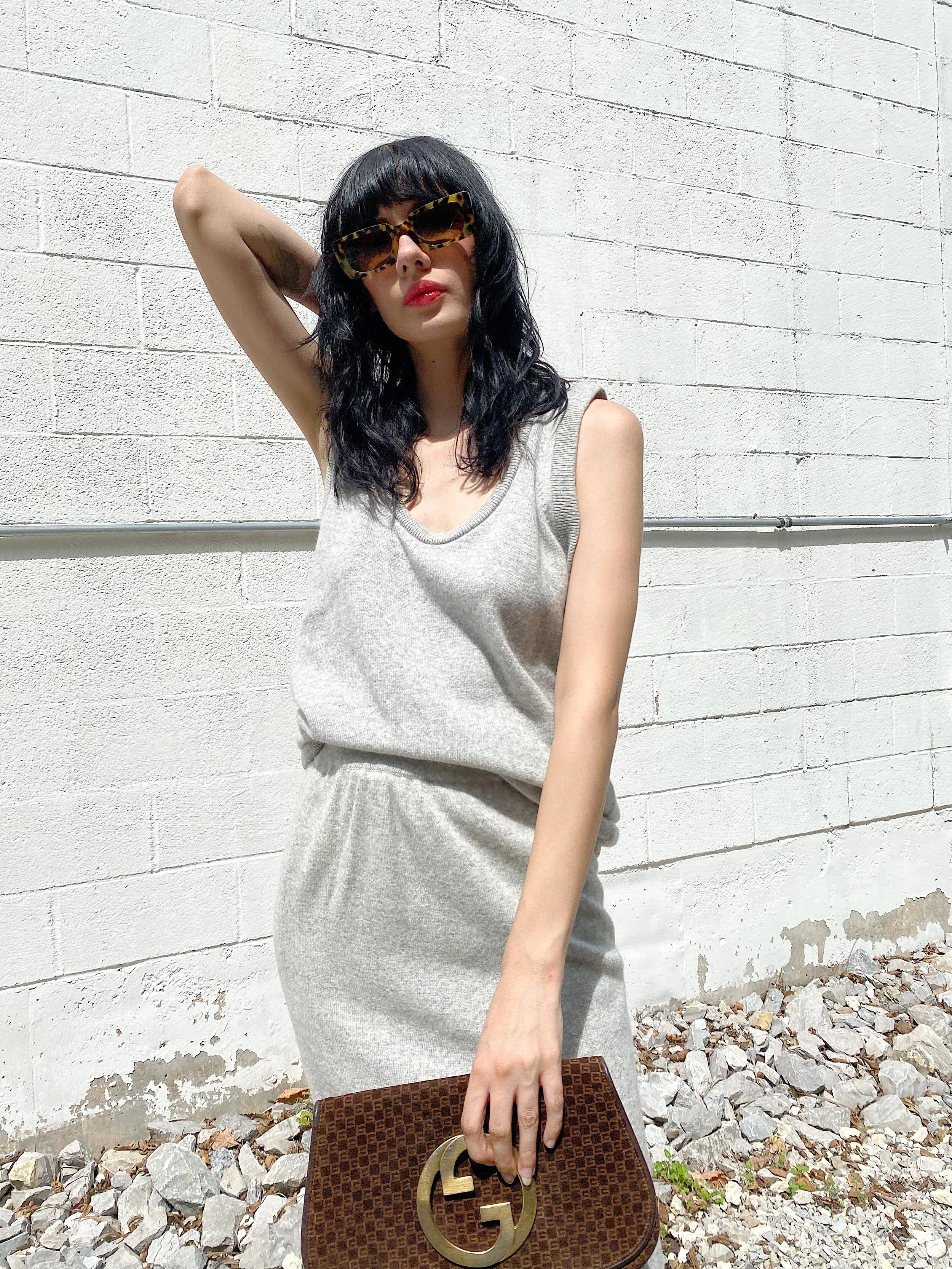 Cozy up in this 90s MK pebble grey set. Made of the softest thick cashmere, this skirt and tank set is a dream. Simple tank top with an elastic waist midi skirt. Ribbed detail can be found along the trim of the top and hem of the skirt. This look can easily be paired with your favorite pumps for a dressed up feel or sneakers for easy lounging.