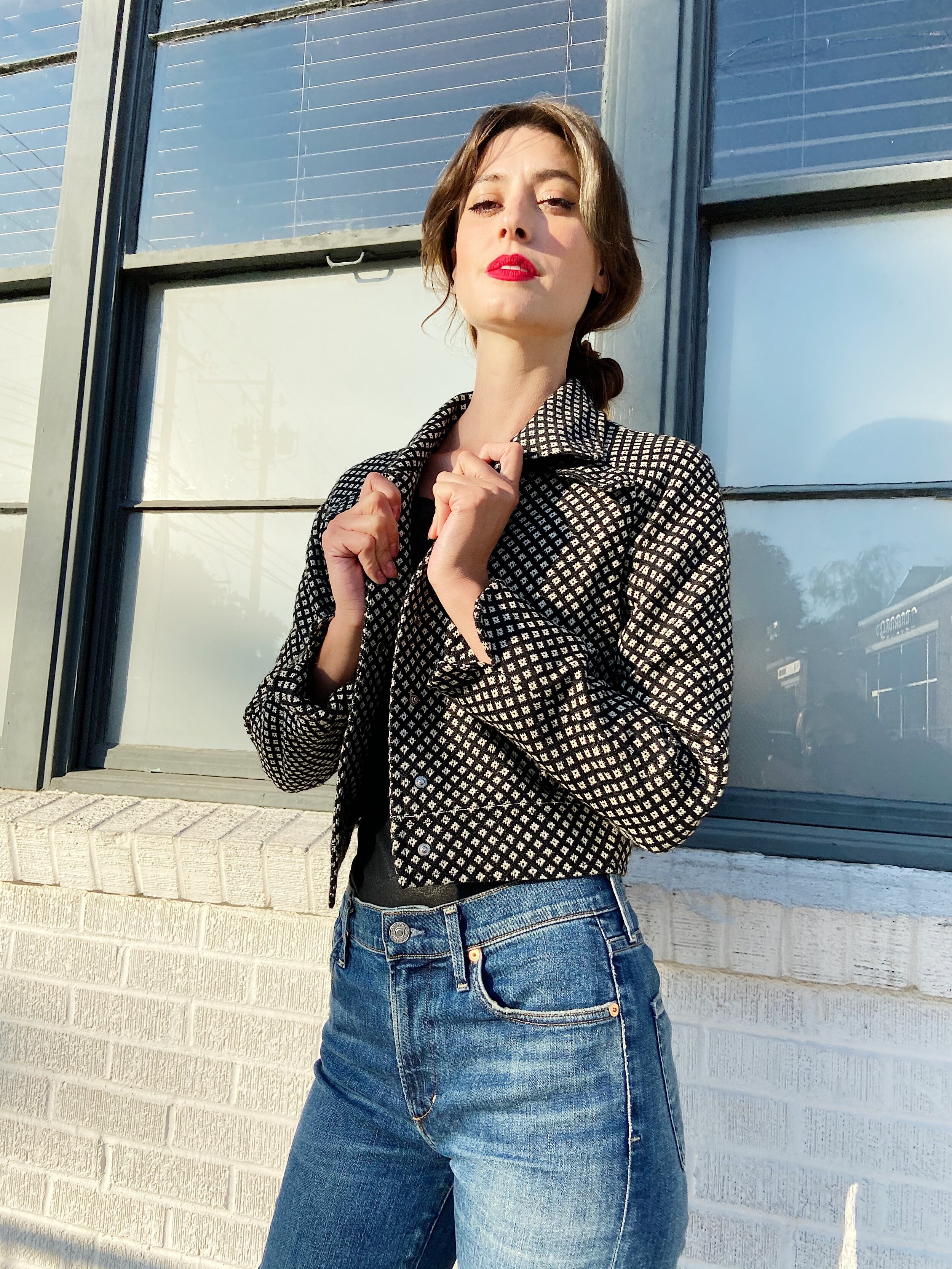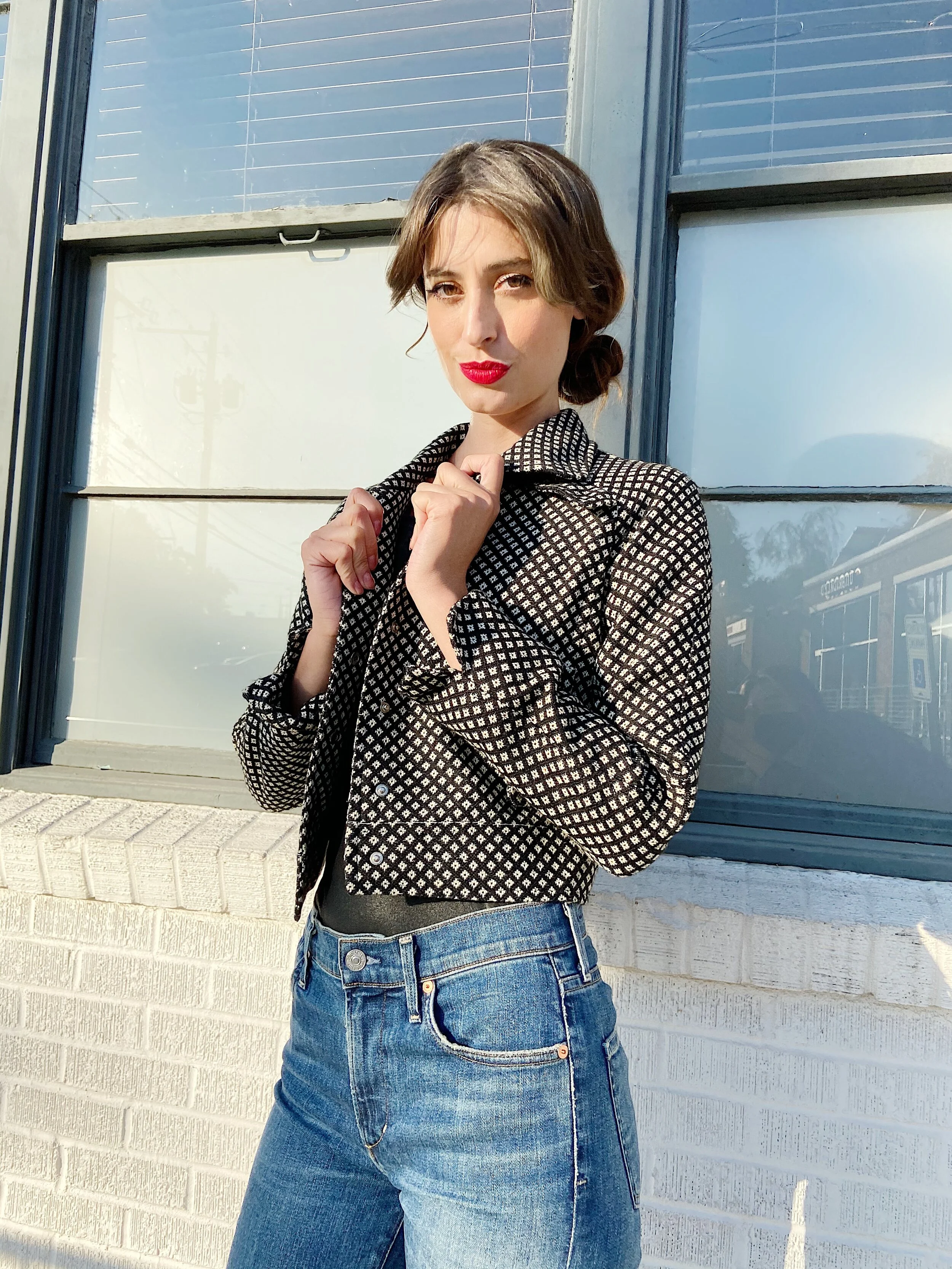 This woven wool Ungaro jacket is the perfect print. Super cute cropped boxy shape, with black snap button closures along the front. Front-side of this jacket has four faux pockets along each of it’s four corners. Jacket is complete with rounded collar detail with snap closures along the back. We are obsessed with this cheeky silhouette!