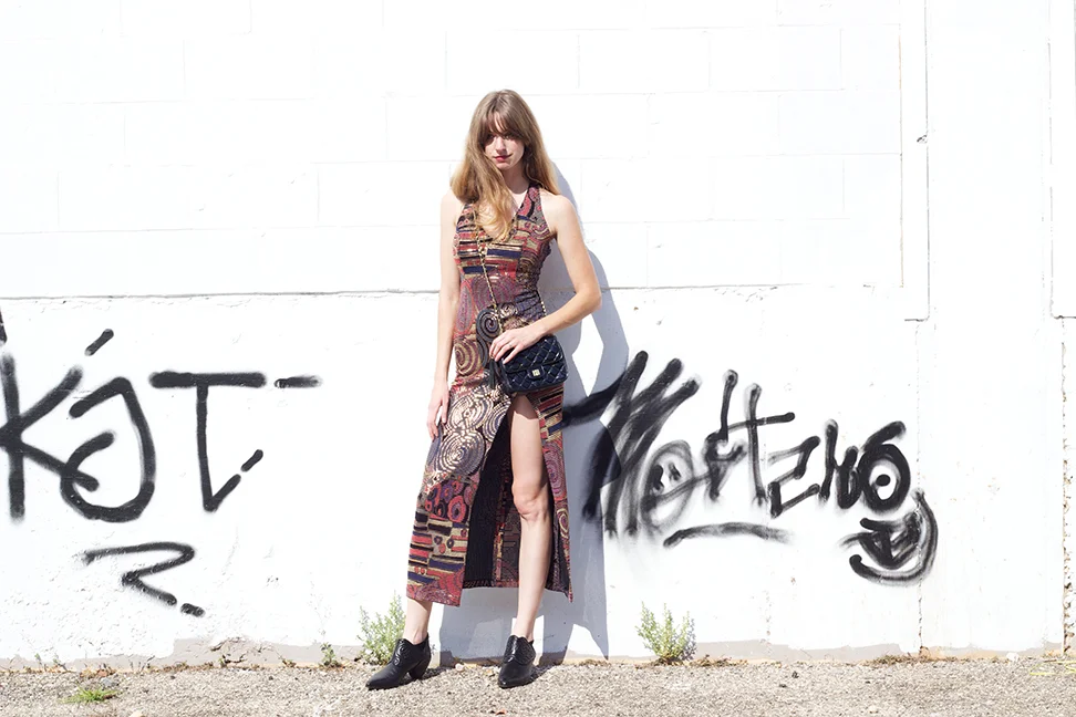 Alex is wearing a VINTAGE 90s multicolor chainmail maxi dress sz.S - $175, Givenchy 80s quilted leather purse - $195, and Via Spiga 90s black leather booties Sz.10 - $90
