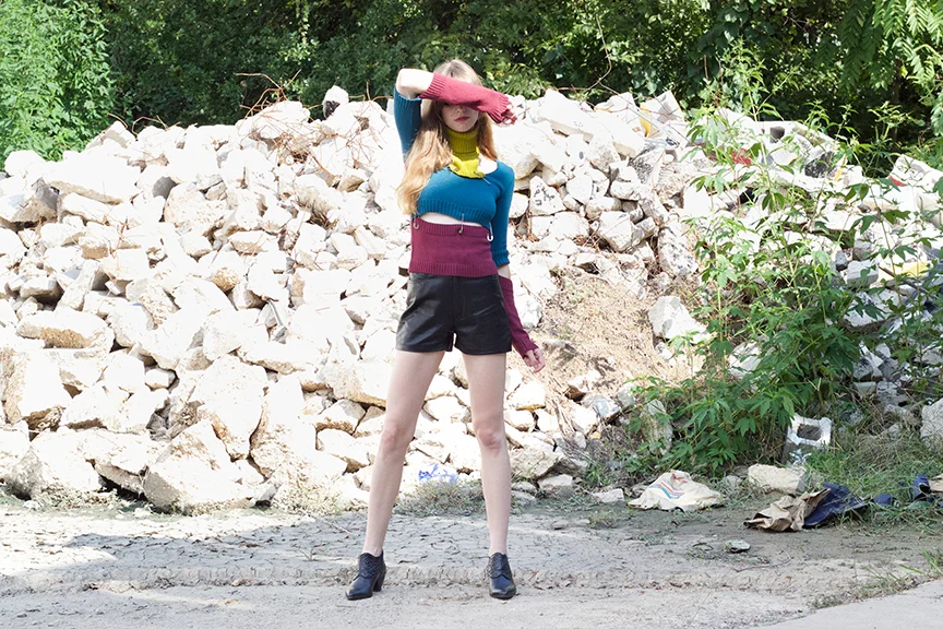 Alex is wearing a Versace Jeans 90s iconic safety pin color block turtleneck top Sz.S - $275, VINTAGE 90s black leather high-waisted shorts Sz.M - $75, and Via Spiga 90s black leather booties Sz.10 - $90