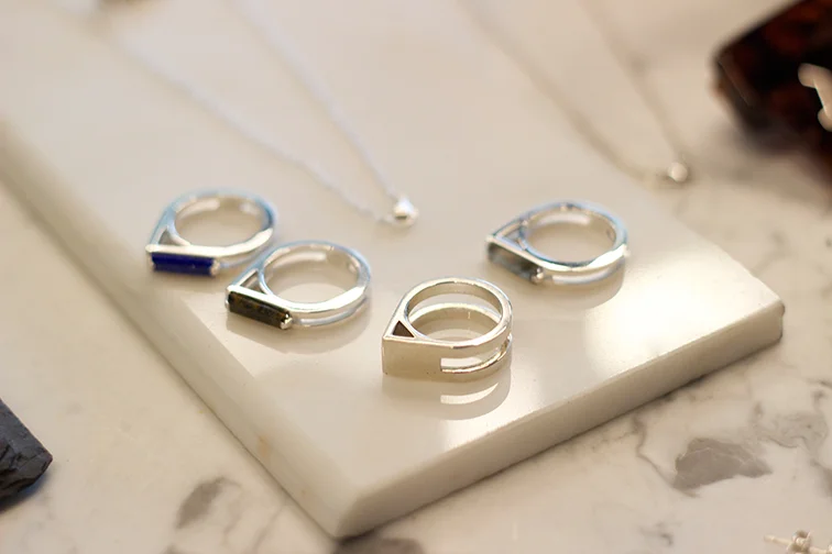 Designer Adrienne Alaimo creates beautiful structures that complement the body. Her line AEA distills a mix of abstract forms and futuristic influences into clean, modern monuments, designed to be worn prominently on their own, or stacked for a bold, architectural feel. The defining aesthetic is strong and feminine with subtle, dark undertones; each piece a sculpture in itself. We are in love.