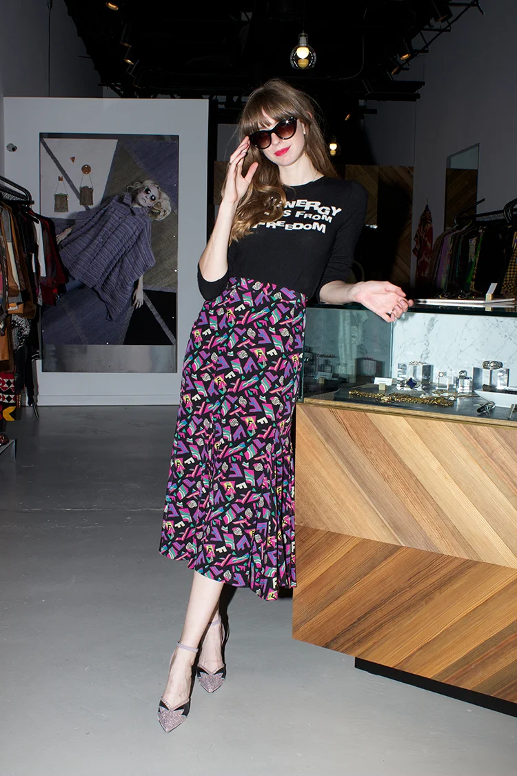 Alex is wearing a Fendi silk skirt - Sz.4 $145, Comme des Garcons sweater - Sz. S $165, Finell Iro clutch $545, Thierry Lasry Joyridy sungalsses $445 and Sonia Rykiel crystal pumps - Sz. 9 $95. To purchase call 512-462-4667 or email us at info@shopgarment.com. Photos by Katy Shayne.