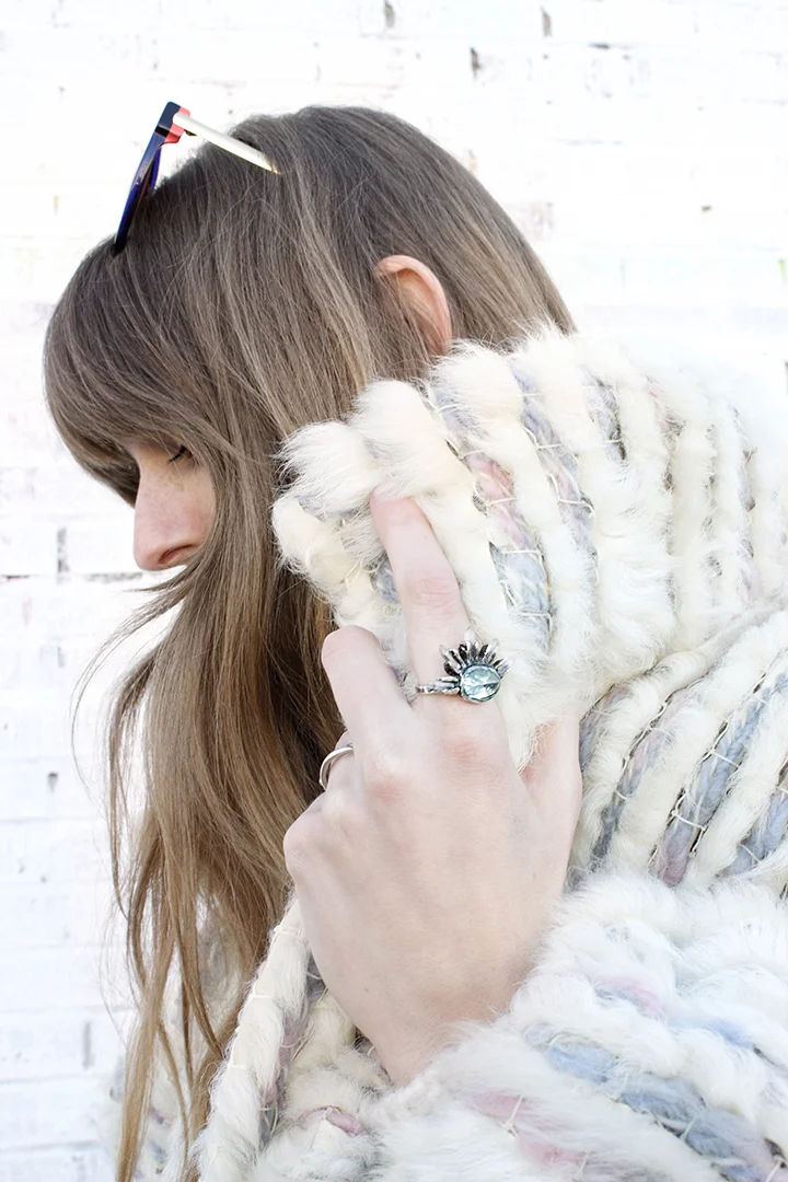 Alex wears this perfect vintage 80s shearling and yarn sweater coat - Size large - $150, Thierry Lasry "Flashy" sunglasses for $435 and ring by Unearthen, size 7 - $375. To purchase, just give us a call!