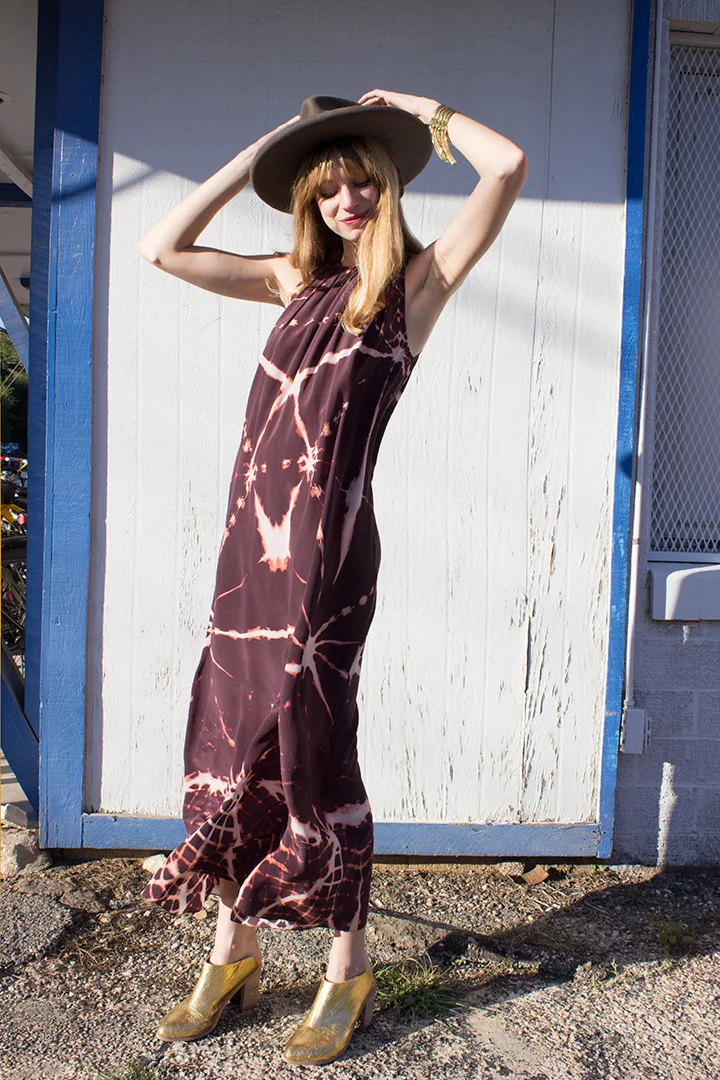 LAURA SIEGEL Ox Blood Clamp Dye Dress $595 (sizes XS, S, M available), WORTH&WORTH "Marfa" hat $235, WAL + PAI Gold "Doheny" Clogs (sizes 8, 9, 10 available), ManiaMania "Magick" bracelet $380. All available ONLINE!
