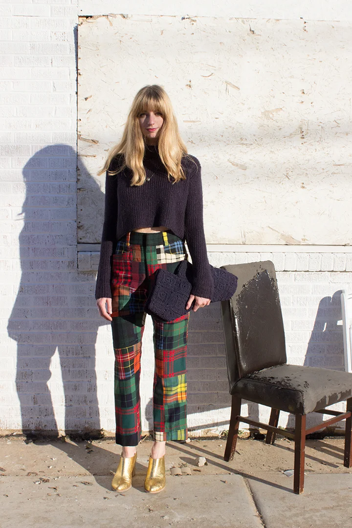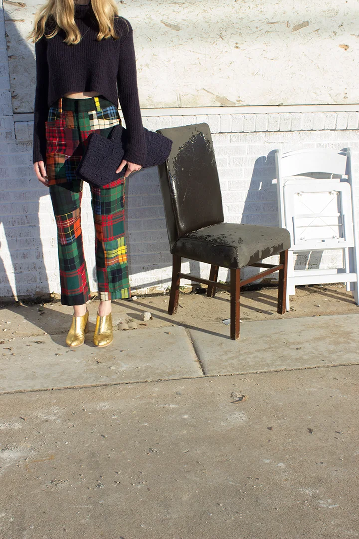 7115 BY SZEKI cropped mohair sweater in navy $180 (size XS-L available), VINTAGE 1960s plaid patchwork pants $115 (size M), WAL + PAI "Dohney" gold mules $495 (size 8, 9, 10 available), VINTAGE 60s Navy Macrame Oversized Clutch $95