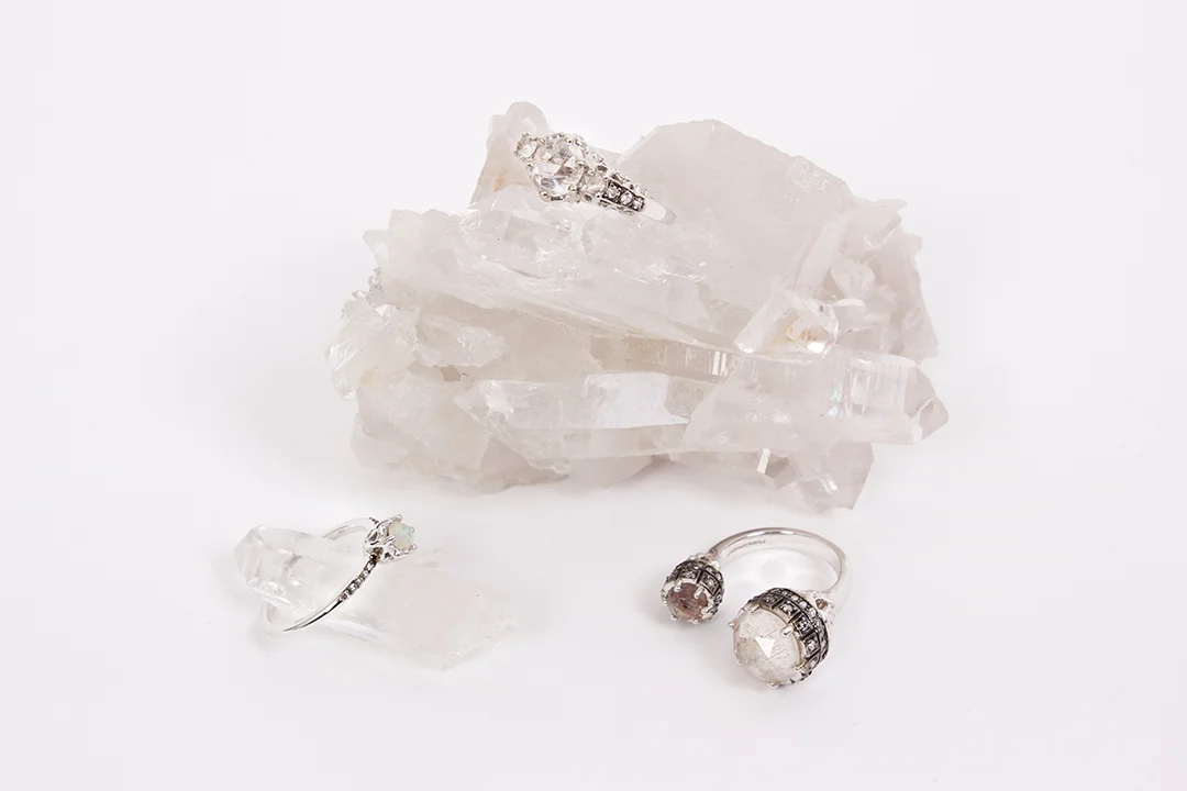 MANIAMANIA Immortalia Mineralia Ring in Sterling Silver With Rutile Quartz, Rose Cute Smokey Quartz and Pave White Diamonds size S/M and M/L Available - $3900