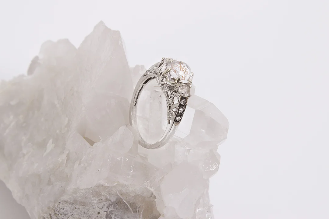 MANIAMANIA Immortalia Ceremonial Engagement Ring in 14K White Gold With Rose Cut Rutile Quartz, Rose Cut Smokey Quartz and Pave White Diamonds size 7 - $2795