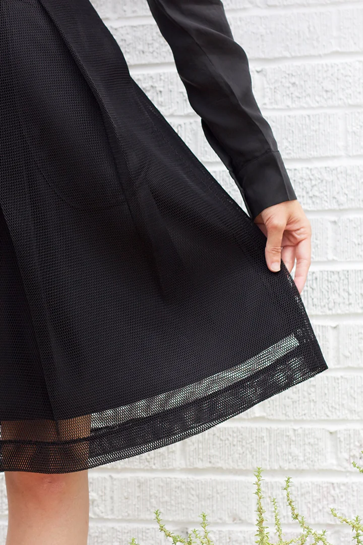 7115 by SZEKI Stitched Collar Blouse $185 (sizes XS,S,M available), 7115 by SZEKI Fishnet Skirt in Black $190 (sizes XS,S,M,L available).