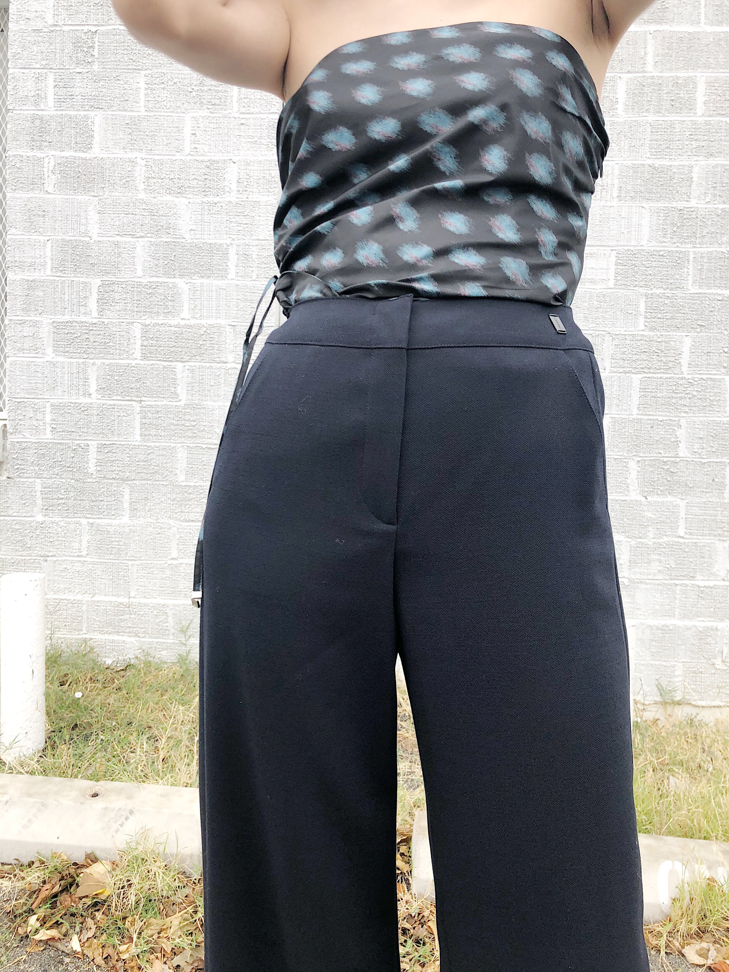 The suit of your dreams. Made of a deep navy wool, this Chanel set is dated from the 1999 Cruise Collection. High-waisted pants with a wide-leg fit pair well with any blouse in your closet. The blazer features scalloped lapels, two pockets, and a two button closure at the waist. Wear this time and time again, it’s a wardrobe staple!