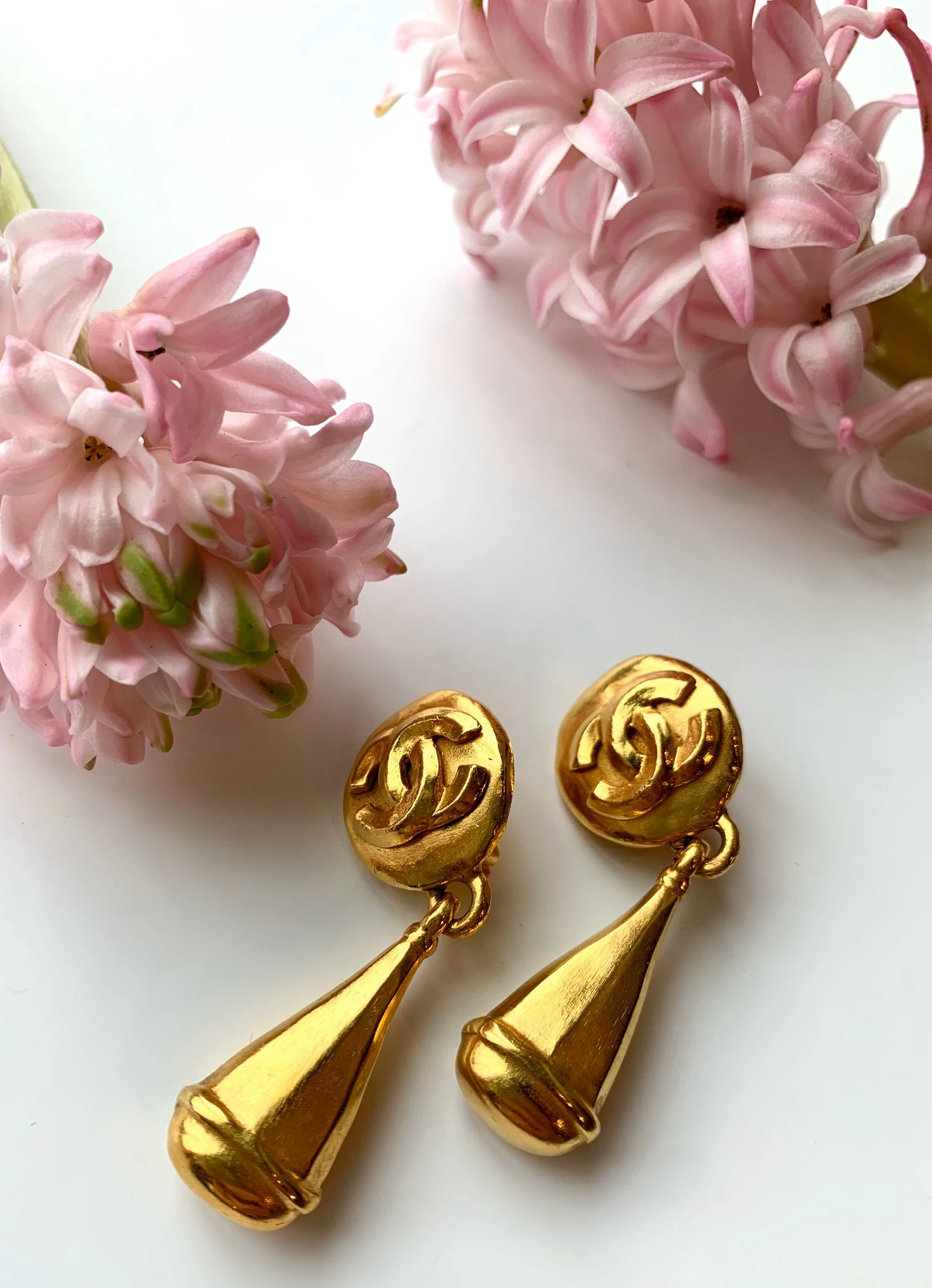 Go for the gold in these perfect vintage Chanel statement earrings! Featuring a round clip on base embossed with the signature “CC” logo and a simple tear drop dangle. We can totally imagine these earrings perched on Claudia Schiffer as the lights went down and Karl Lagerfeld’s 1996 runway began.