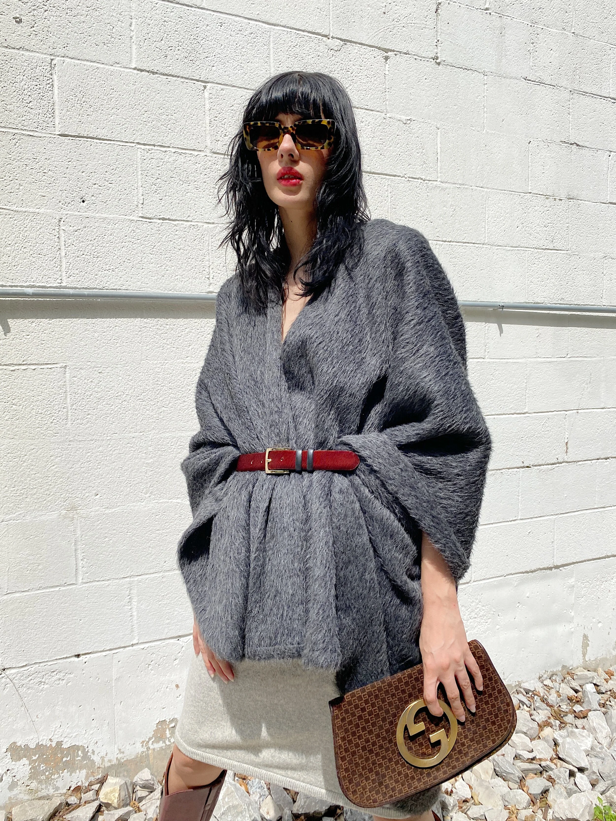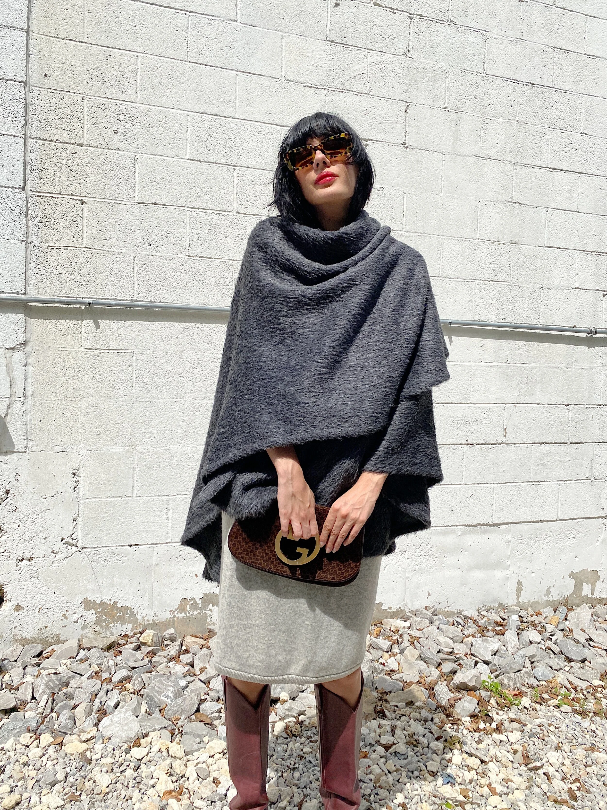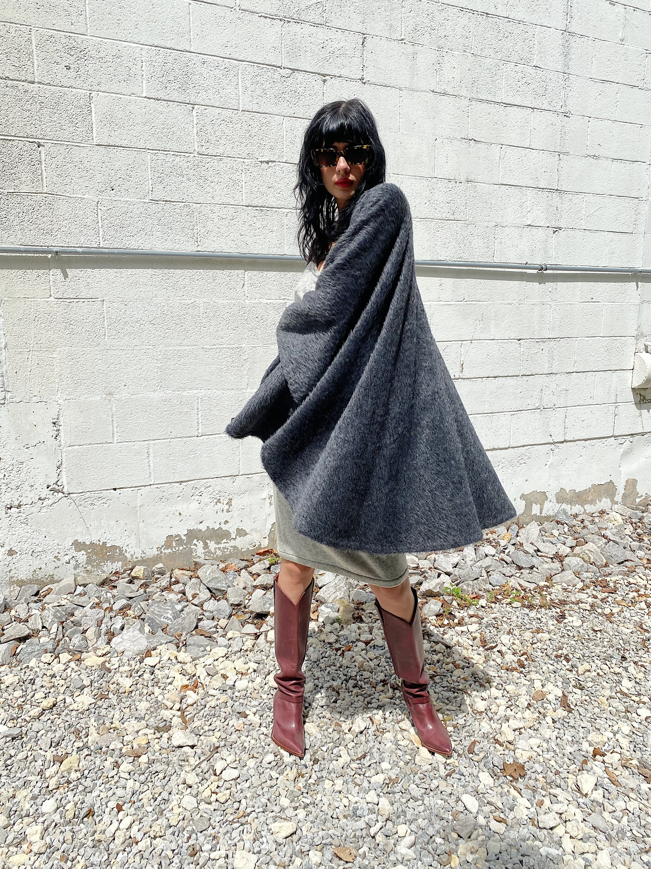 Simple yet timeless, this Donna Karan can easily be implemented as the newest staple piece in your wardrobe. This poncho wrap is made entirely of mohair in a rich charcoal grey color. The weight and structure bring an element of drama while remaining so cozy and comfortable. Open sizing, as well as great for layering and travel. We are so ready to snuggle up in this.