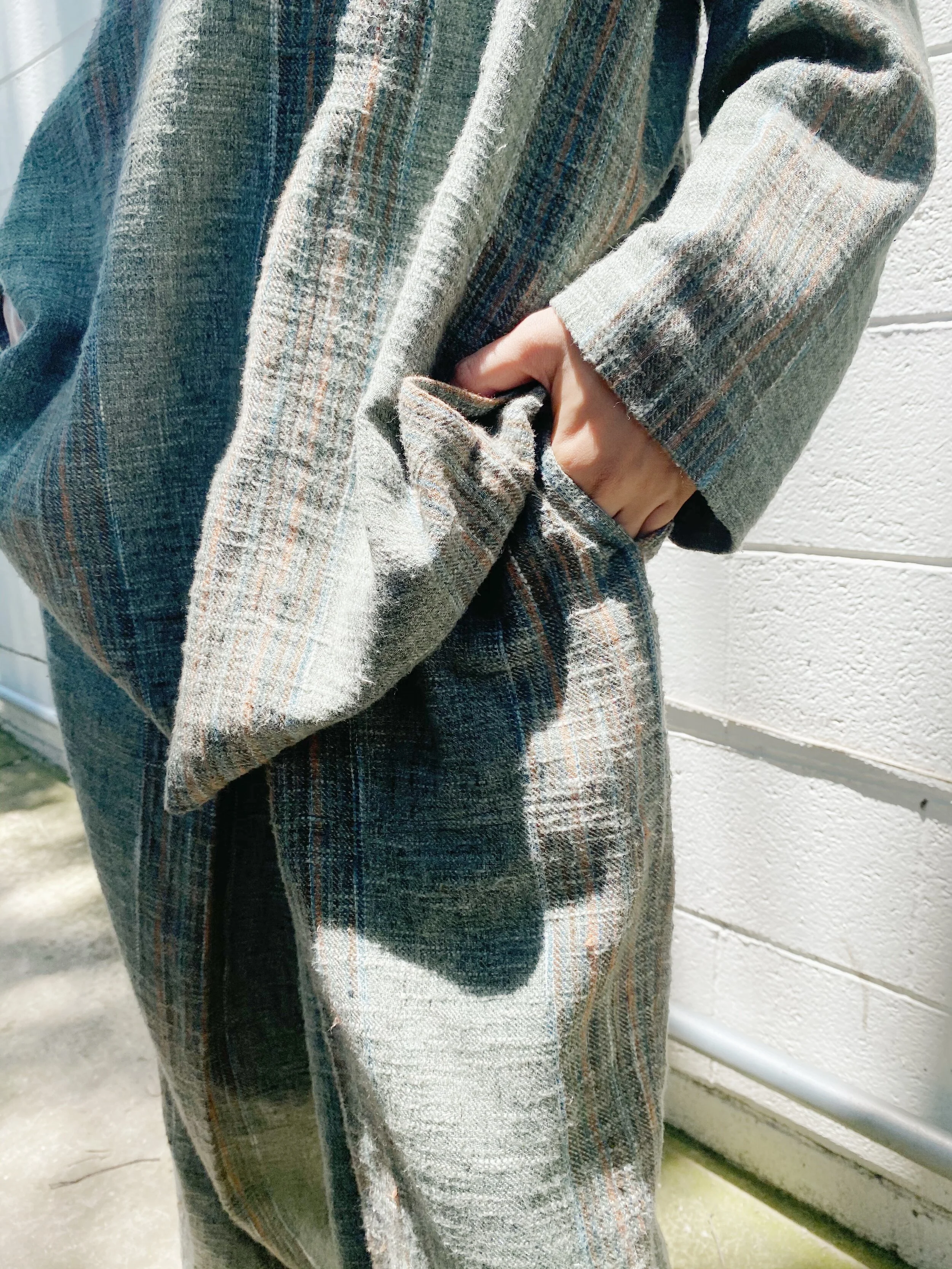 Say hello to your “go to” lounge set. This Issey Plantation set is ideal for a comfortable effortless look. Tunic portion of this garment is oversized with a v-neck shape and giant lapels that can be worn open or buttoned into a cowl. Tunic is intended to pull over the body. The pant portion has the same slouchy fit with an elastic waistband and cropped pant. Both the tunic and pants have pockets for easy carrying of necessary essentials.