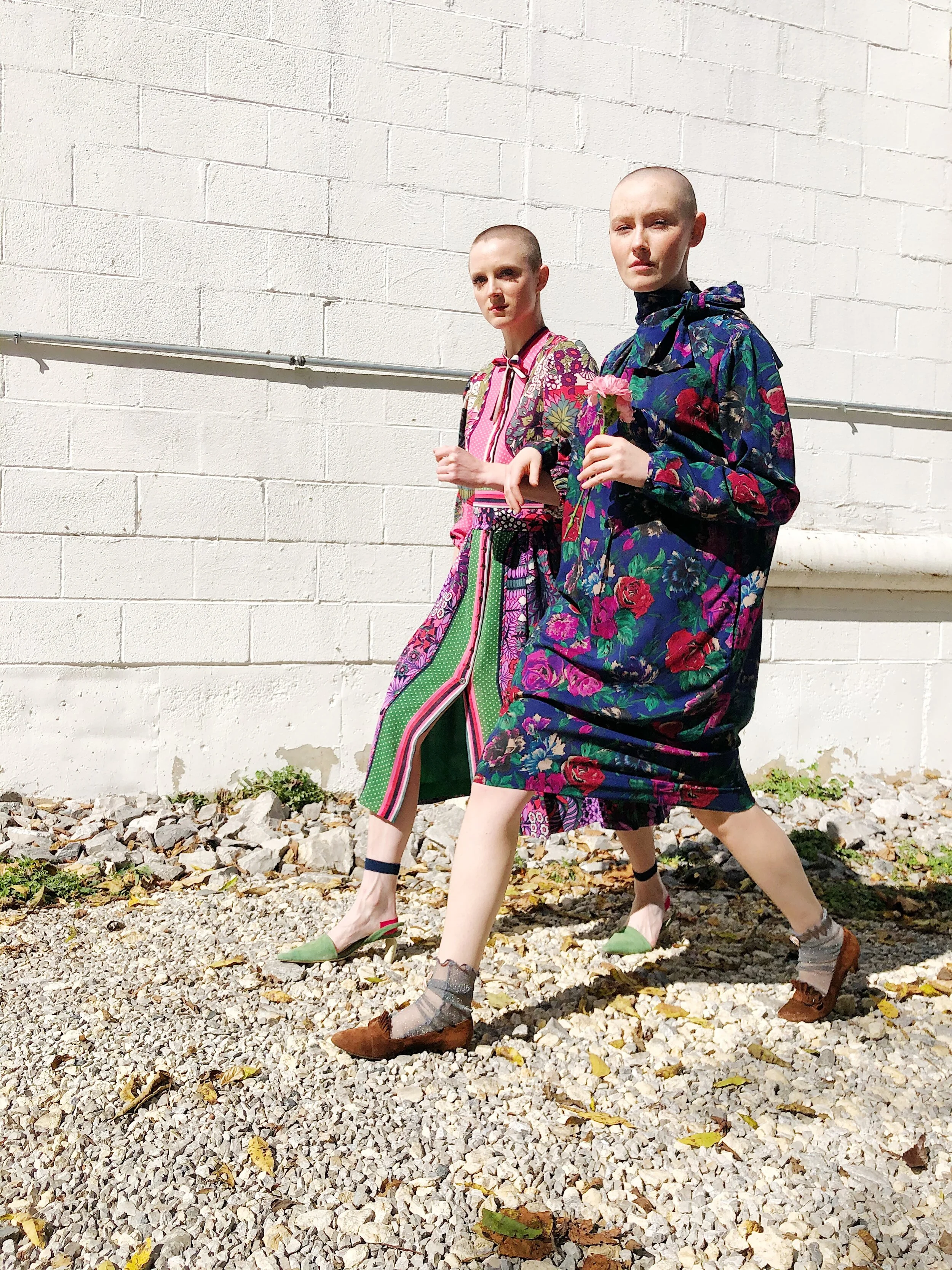 A sweet combination of florals and polka dots dons this 80s Lanvin Shirt Dress. A tie at the neck adds an extra bit of femininity. Buttons closures fully line the front up to the neck. Comes with an extra wide sash for the waist. We love this for a day-to-night look, pair with a funky color shoe!