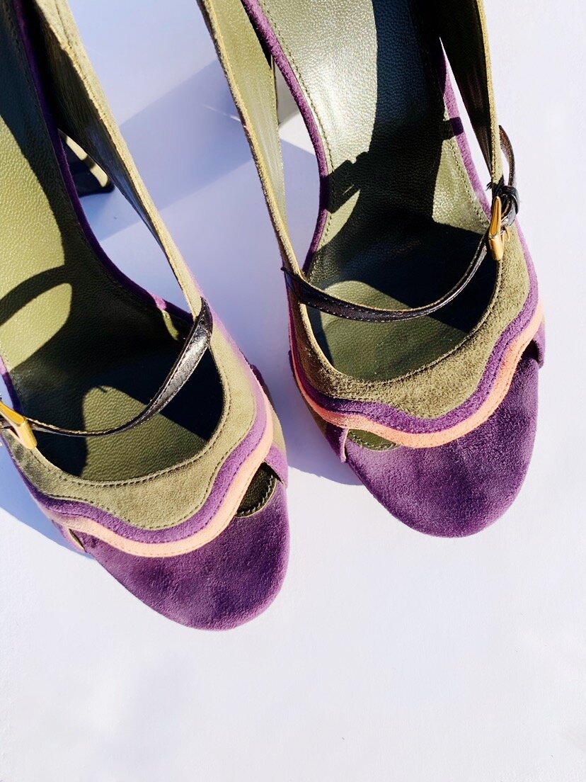 Treat yourself to these Prada pumps from the Fairy Collection Spring/Summer 2008. The olive green suede leather upper has slim color-blocks of pink and purple. The curved chunky heel is color-blocked with green and purple suede leather. Features thin leather straps with adjustable gold-tone buckle, a peep toe, and slightly stacked pump. Almost too good to be true!