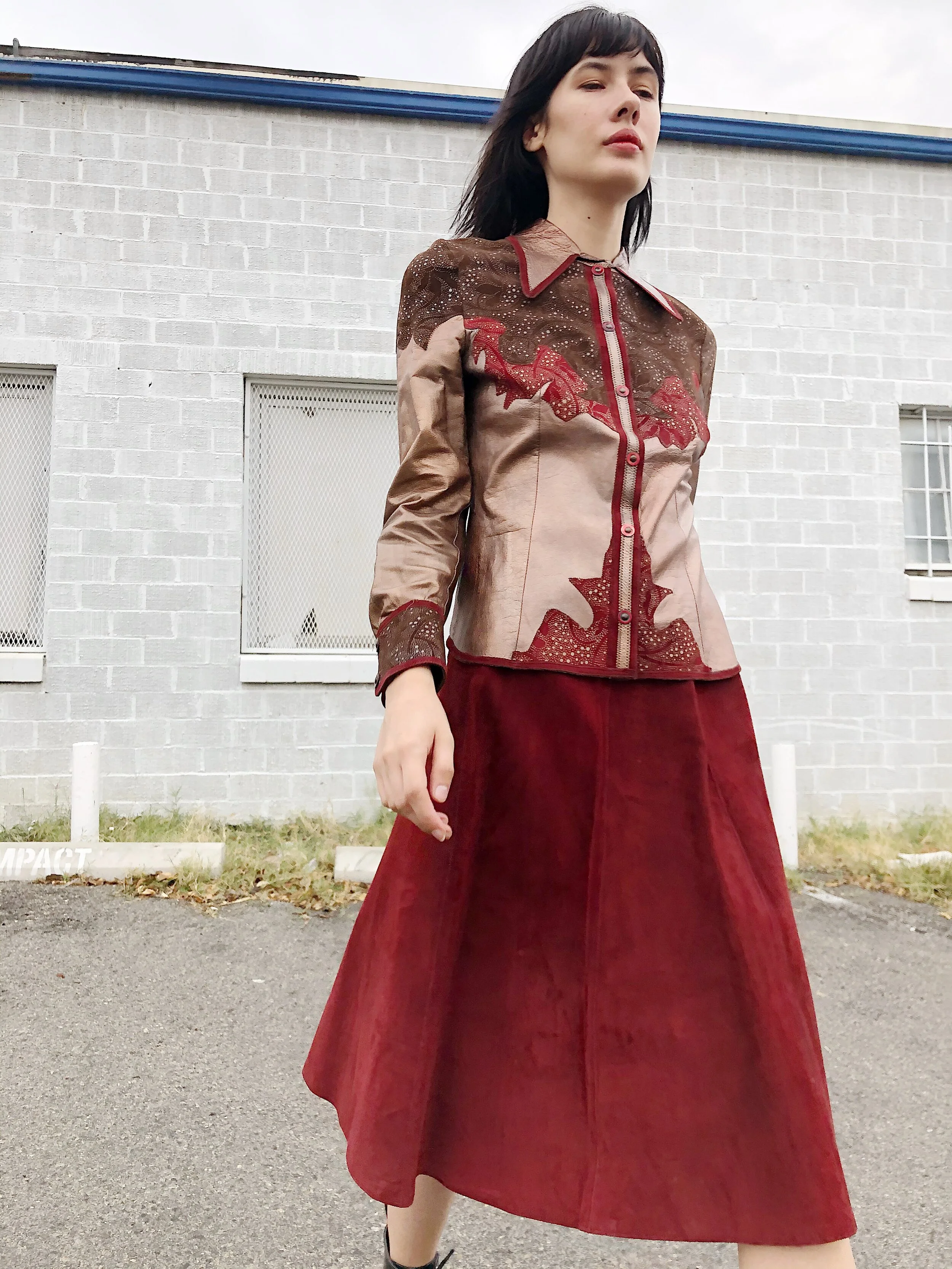 Utlra rare! You’ve never seen Cavalli like this before. A classic 70s silhouette rendered in luscious copper leather & deep raspberry suede. The patchwork features brown and red suede with grey painted mini polka-dots, adding texture, dimension, and a little bit of western flare! Leather blouse has red enamel snap front buttons, two buttons at wrist with painted brown suede detail. Skirt has a side snap & zipper closure.