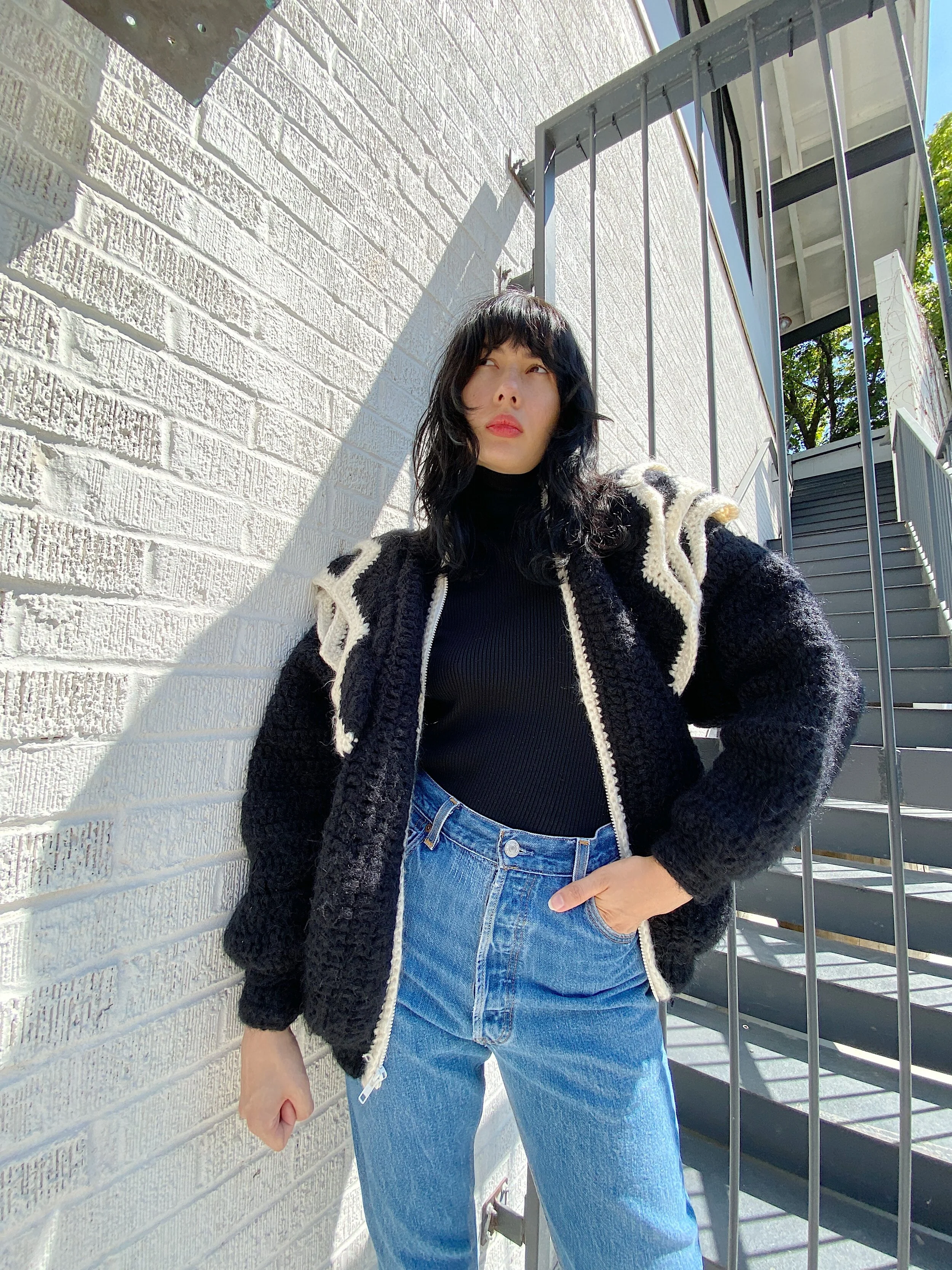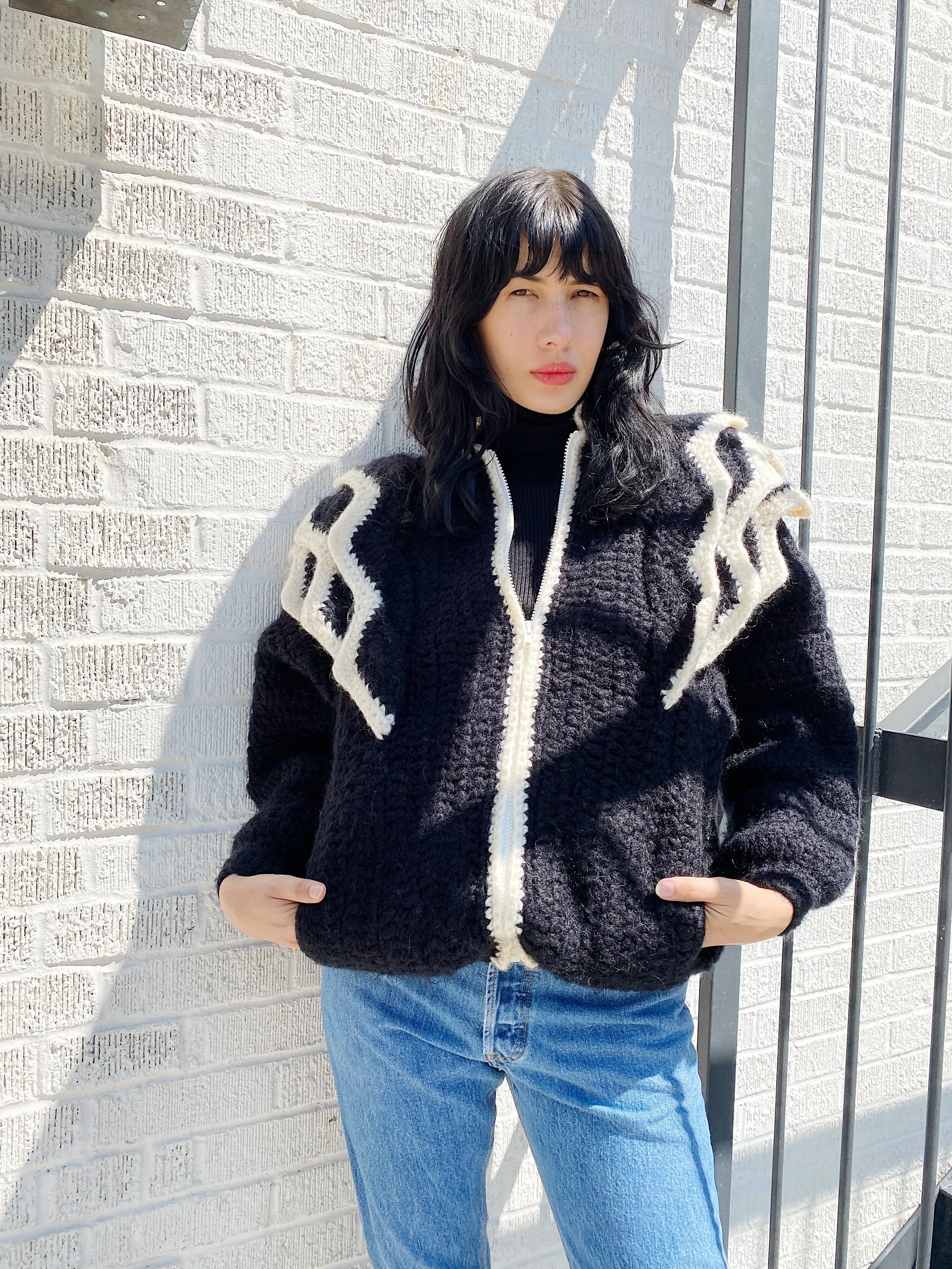 How fun is this 80s Sonia Rykiel knit?! This super heavy-weight black and white knit wool jacket features an exaggerated zig zag shoulder detail that continues along the backside giving it a great dramatic effect. Standing collar mimics the shoulder detail. Sleeves sit lower on the shoulder in a balloon shape for added volume. This jacket definitely packs a punch and is not for the faint of heart.