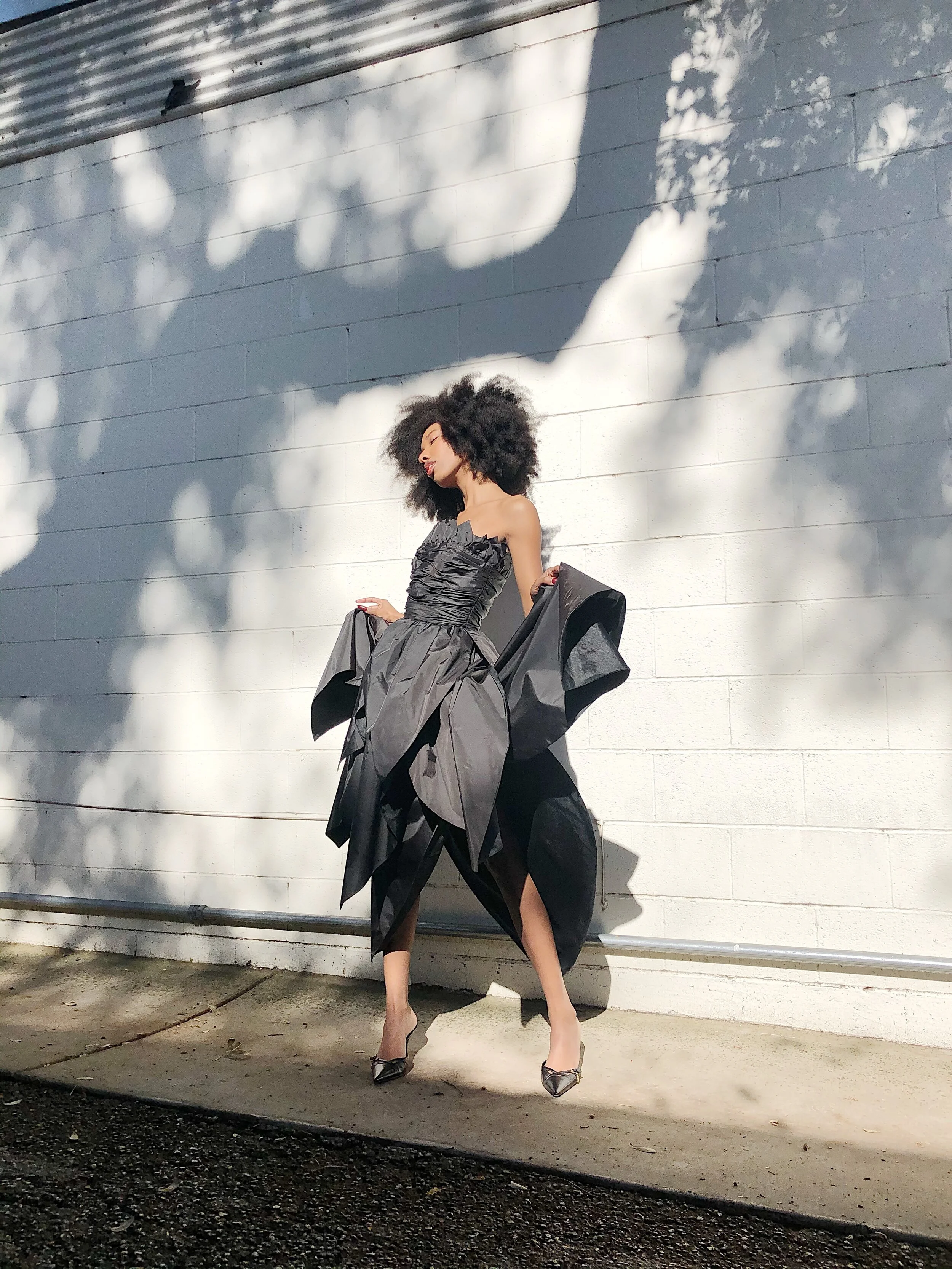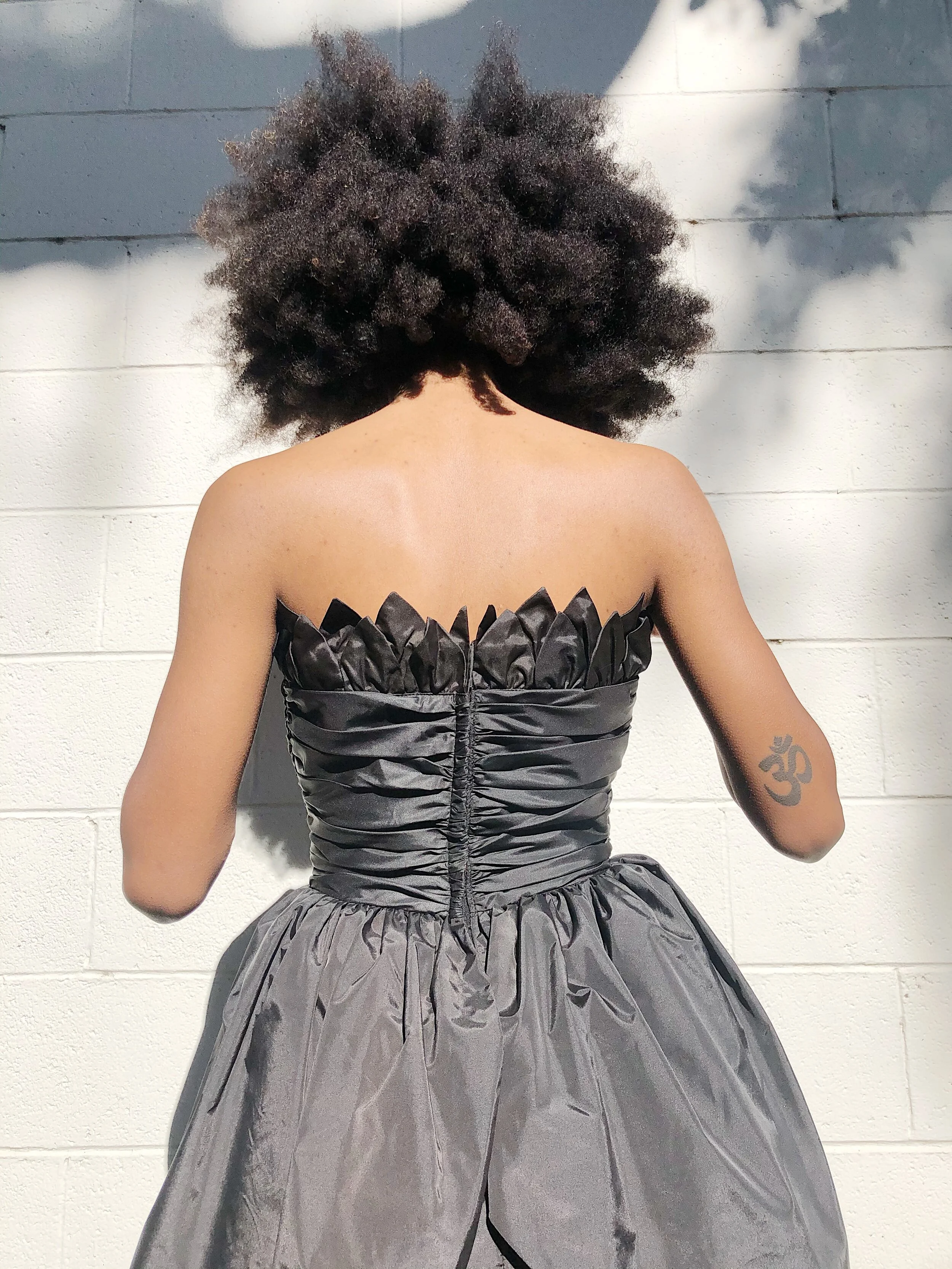 A romantic black petal gown by Victor Costa! Like a delicate flower, this dress captures the true essence of a bloom. A strapless fit has tiers of petals that form an assymetrical hem skirt. The ruched cummerbund style waist has boning for support. Hidden zipper at back.